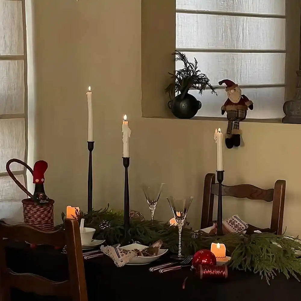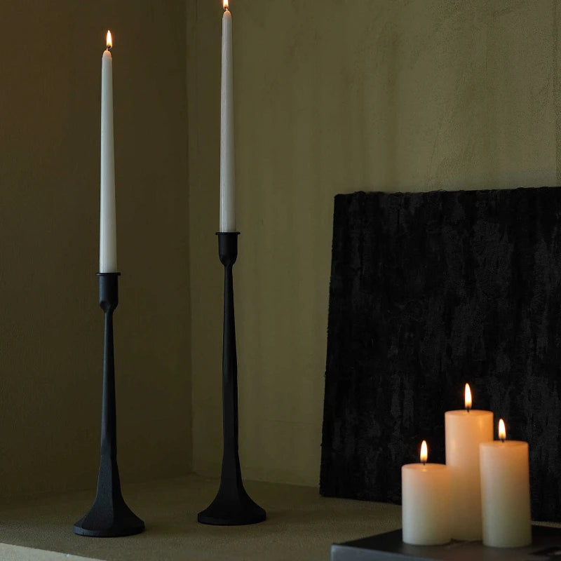 The subtle textural variation and weight of the iron express an artisanal quality, while the elongated proportions add height, drama, and warmth to any setting. Whether styled along a dining table, anchoring a console vignette, or accenting a moody bookshelf, these holders introduce a serene, sculptural presence that elevates any atmosphere.