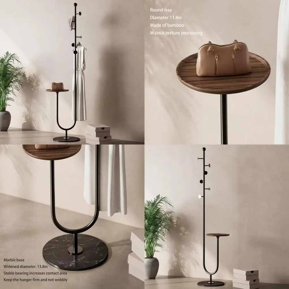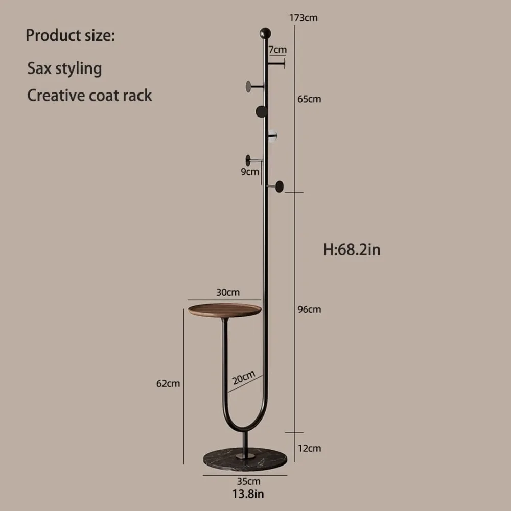This item features a charming saxophone-shaped design that is both sophisticated and space-saving. Its smooth surface prevents your clothes from getting scratched, while the circular bamboo tray at the end, measuring 11.8 inches in diameter, provides a convenient spot to place your wallet, keys, gloves, bag, and other items. The freestanding coat rack boasts a high-quality frame made from premium metal, chosen for its durability and strength. This heavy-duty material ensures the rack remains stable and sturdy, even when holding a significant number of coats, hats, scarves, and accessories. The coat rack is equipped with a widened marble base that offers exceptional stability and adds a touch of elegance to your home. The solid marble not only enhances durability but also contributes to the sophisticated look. The base is spacious enough to accommodate a pair of shoes as well. This modern coat rack is versatile for multi-scenario use, making your home or office tidier. It can store all your daily clothes, bags, hats, scarves, gloves, and other personal belongings, including mobile phones, keys, and wallets. It's perfect for placement in hallways, bedrooms, cloakrooms, or offices, ensuring you stay organized upon entering any space. Assembly is a breeze with detailed installation instructions and all necessary accessories provided. You can easily put together a sturdy coat rack in just 10 minutes.