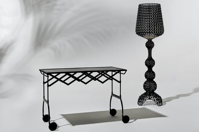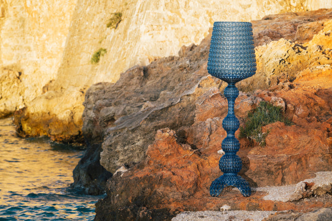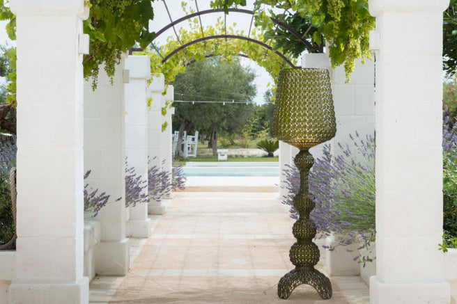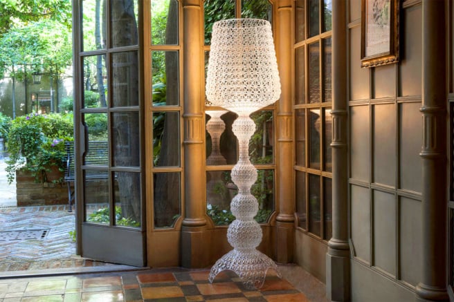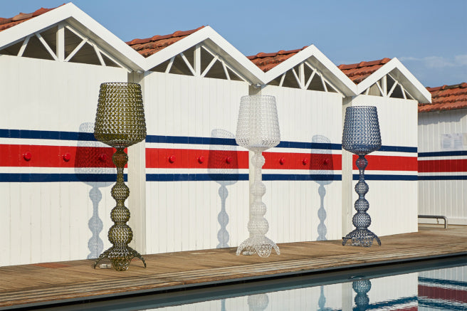 Designed with versatility in mind, the Kabuki Floor Lamp by Kartell is suitable for both indoor and outdoor use. The curvy silhouette features geometrically inspired cutouts and is one-of-a-kind, making a grand impression wherever it is placed. With dimmable lights, it illuminates any space and changes the ambiance effortlessly, casting eye-catching shadow designs around the area.