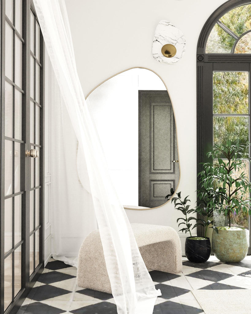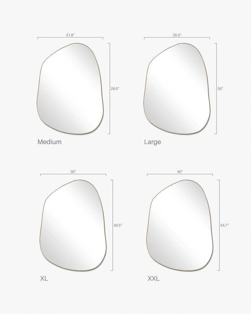 Peak Gold Organik Mirror features an irregular stainless steel frame with a golden tone that reflects light beautifully. Its organic form adds sculptural elegance to spacious interiors, with a dewy finish for a soft, refined look.