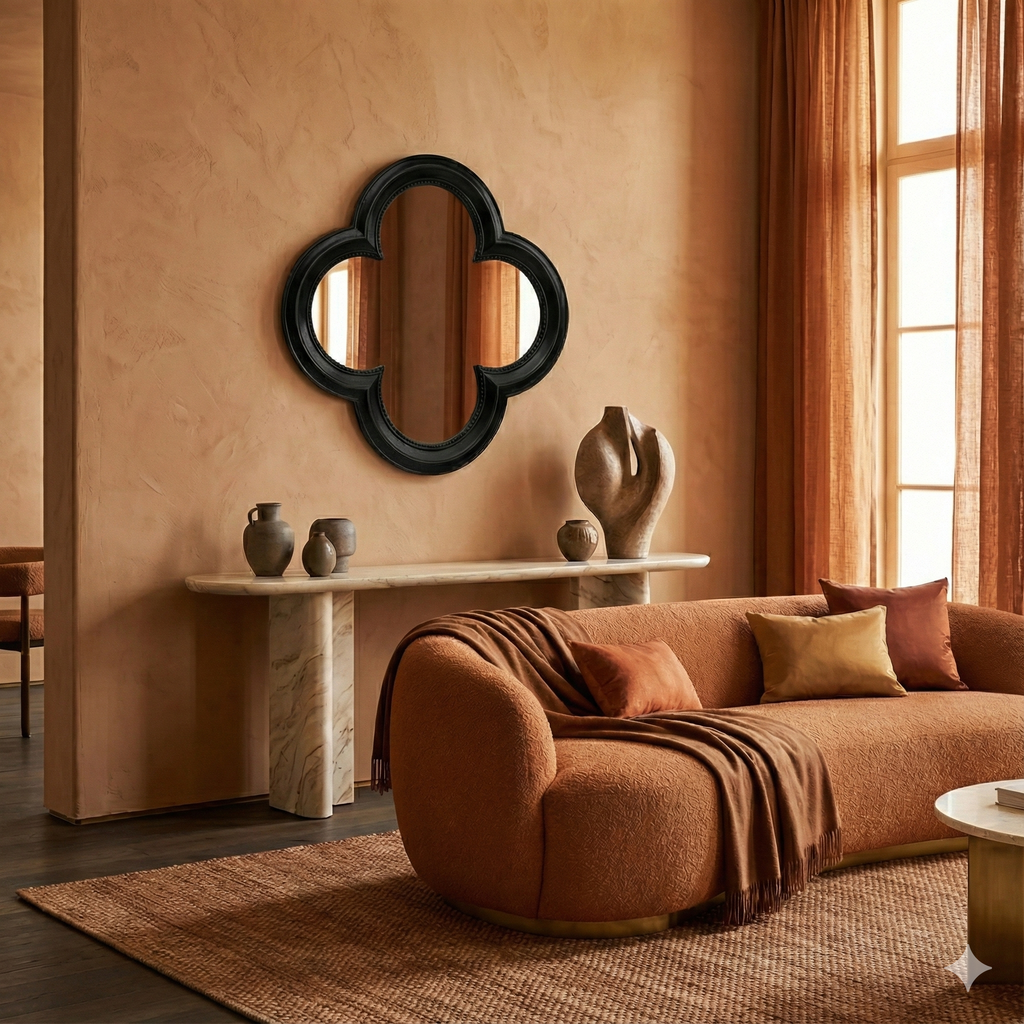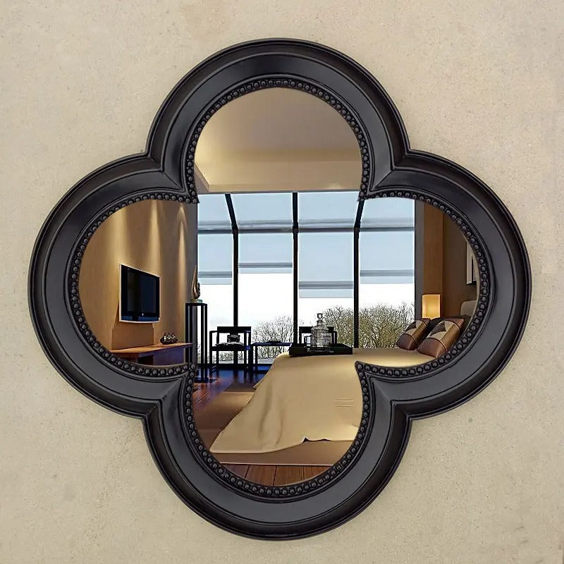 A sculptural clover-shaped black mirror inspired by timeless haute-joaillerie motifs. The Cleef Mirror features soft, rounded petals and a refined silhouette that brings an air of quiet luxury to any room. Its elegant form adds depth, light, and sophistication—perfect for elevating entryways, living rooms, dressing spaces, or gallery walls with a signature touch of grace and glamour.