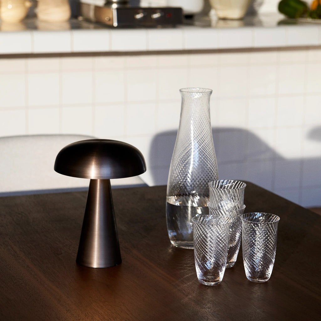 Illuminate your surroundings and match the lighting to your mood with the Como. This stunning portable table lamp features a clean, minimalist aesthetic—its sturdy base tapers up to a beautifully curved, mushroom-shaped shade, reminiscent of iconic mid-century modern design. Crafted from premium anodized aluminum or brass, it adds a touch of sophistication to any space.