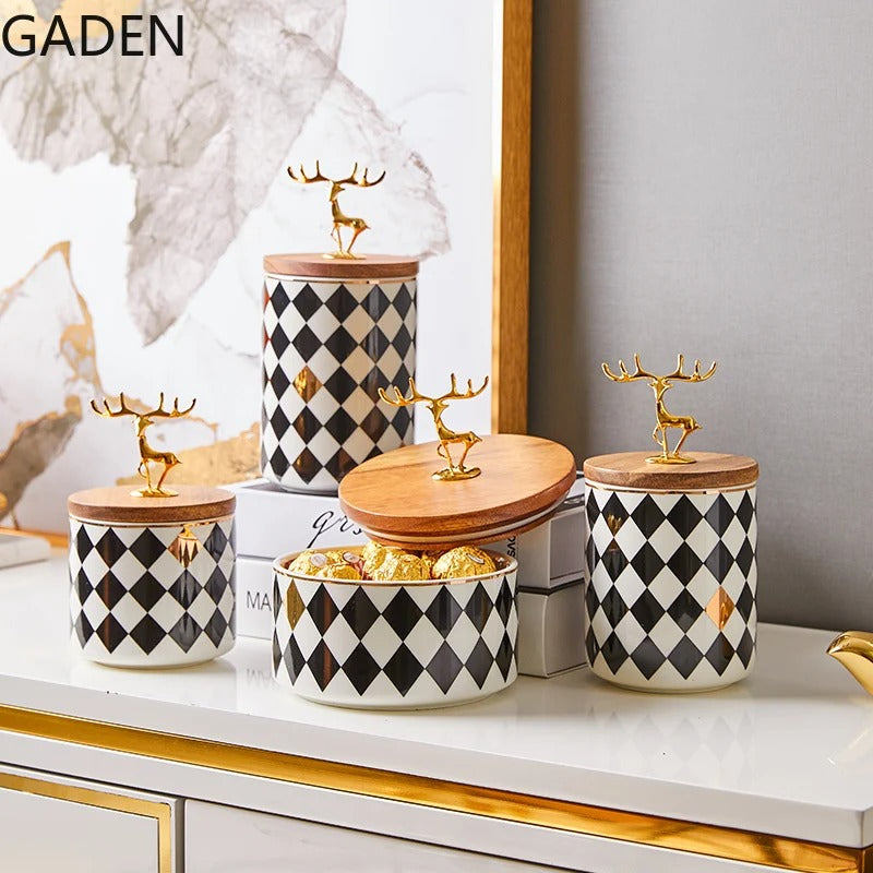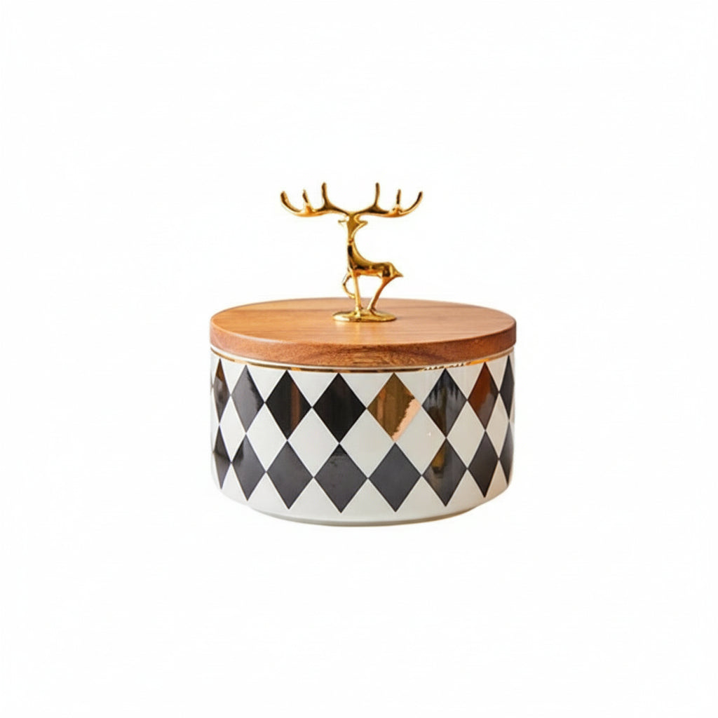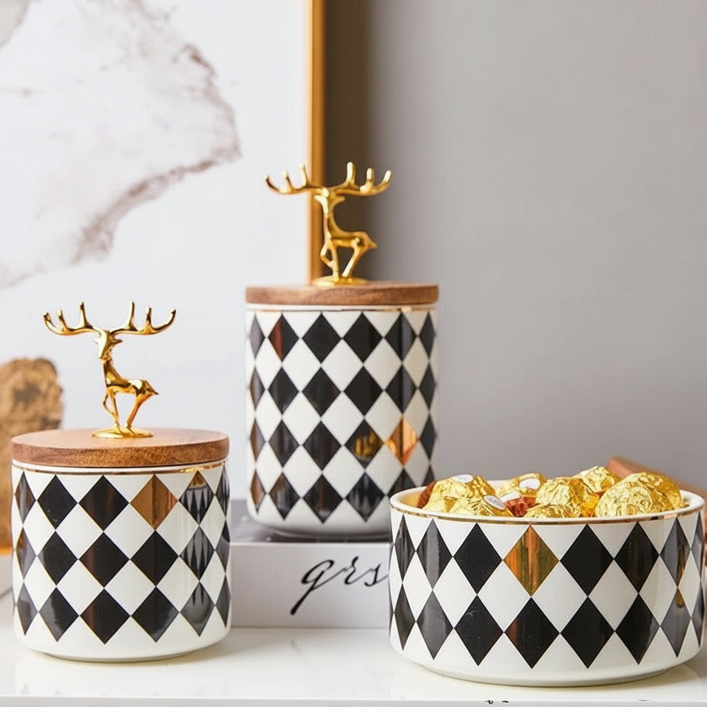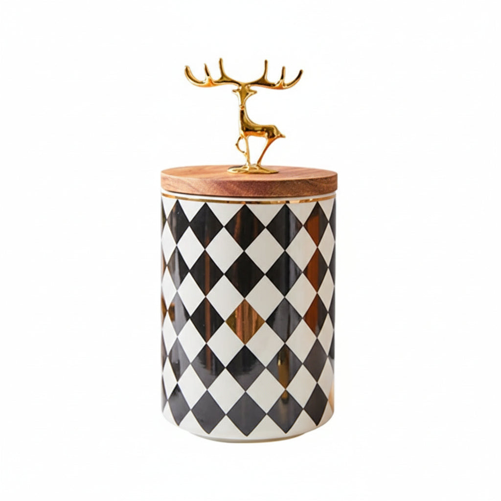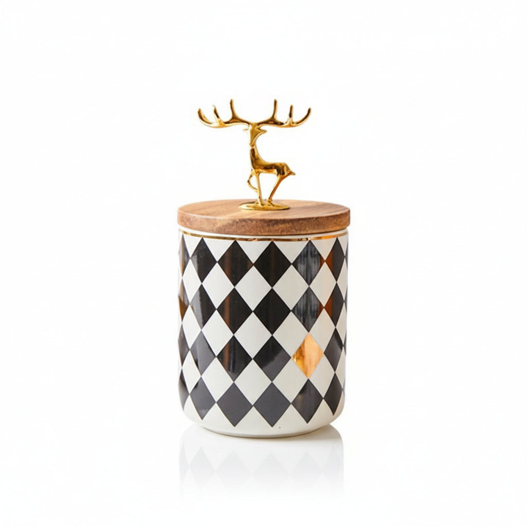 Bring playful elegance to your home with the Studio Gonka Deer Luxe Ceramic Jar, a European-inspired storage piece blending modern sophistication with a touch of festive charm. Crafted from premium ceramic with a smooth, polished finish, this decorative jar features a golden deer figurine lid that adds warmth and personality to any space.